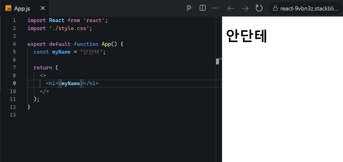 App 컴포넌트와 return 사이에 선언된 변수를 사용자 화면에 보여지게 하려면 다음과 같이 {}(중괄호)를 이용하시죠
