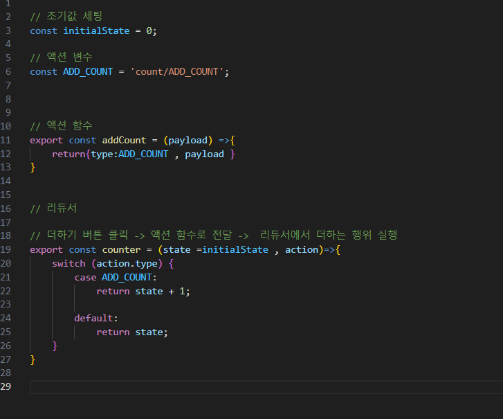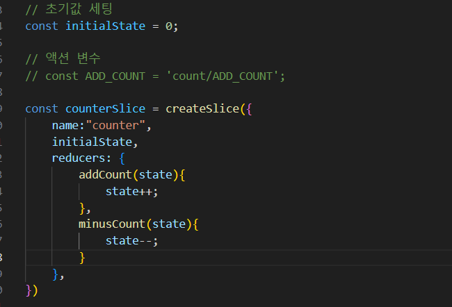 (2) 리덕스에서 action 변수 , 함수를 따로따로 안써주어도 됩니다. createSlice를 이용합니다.