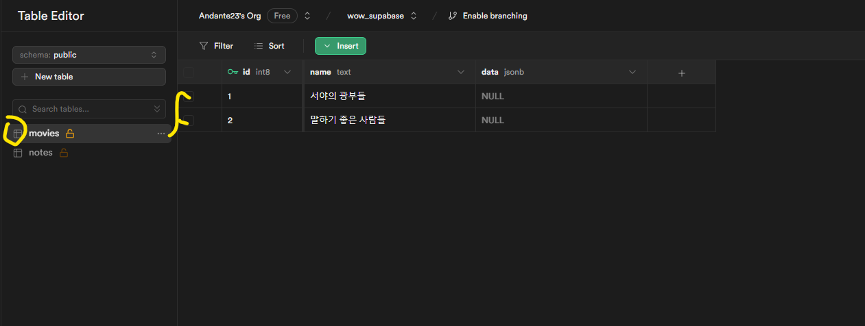 다음과 같이 movies 테이블에 데이터 집어넣기