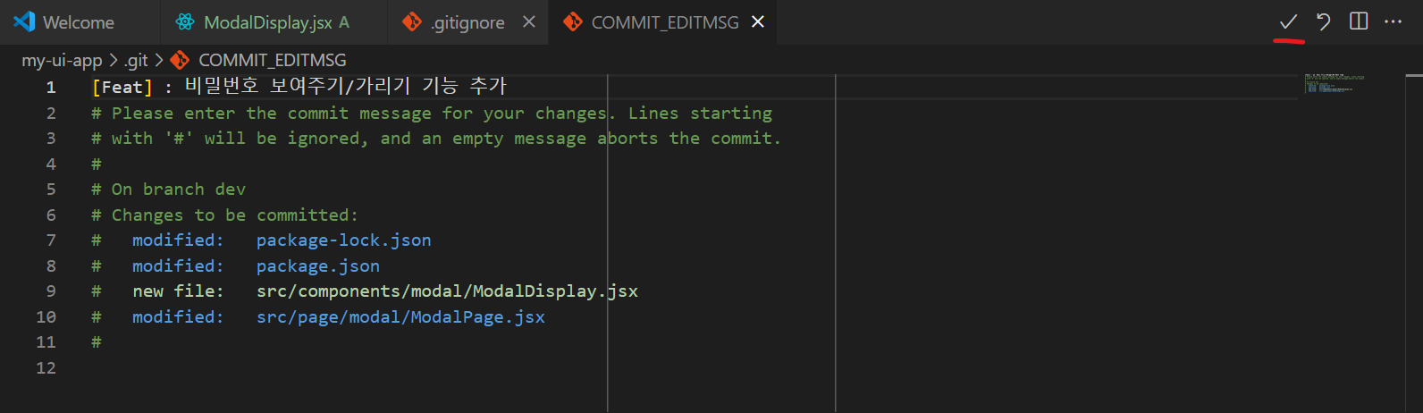 vsCode에서 git commit 를 하여 커밋 창을 실행합니다. 그리고 터미널에서 커밋 메세지 적는 것처럼 합니다.그리고 , 오른쪽 체크 까먹지 마세요!!!