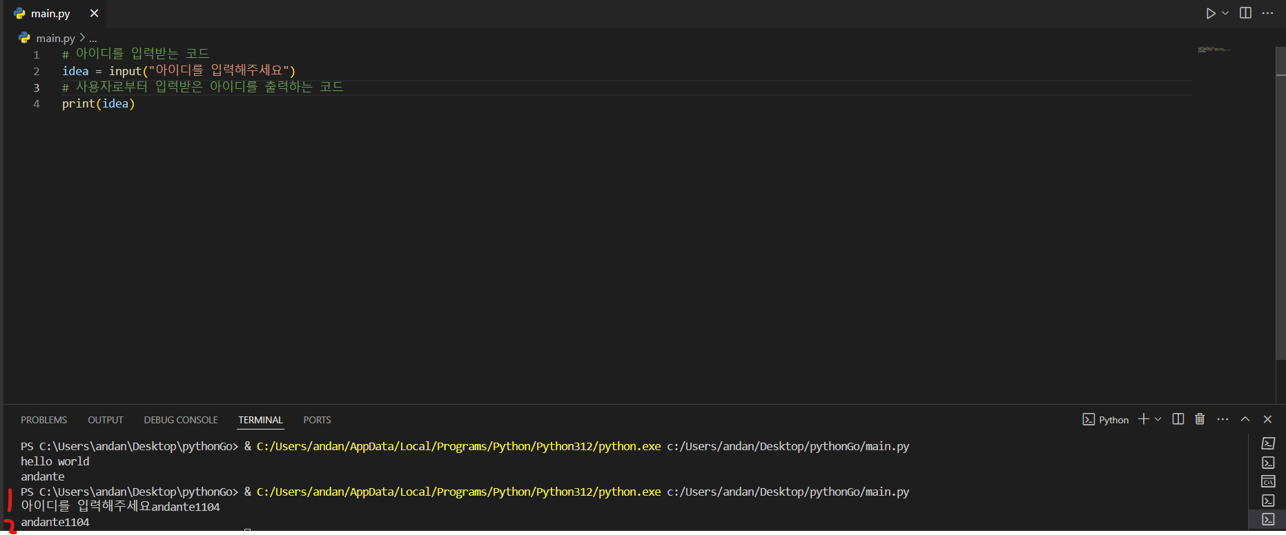 2. 그리고 print 함수를 이용하여 입력받은 idea값을 출력합니다.