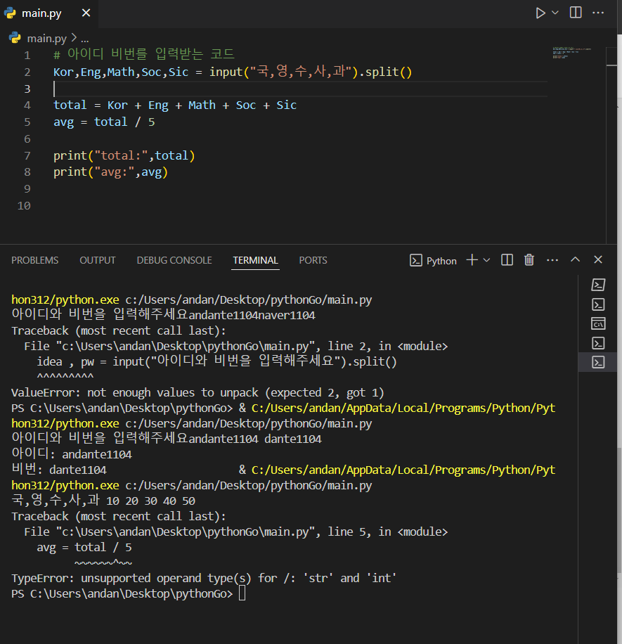 total = Kor + Eng + Math + Soc + Sic # 입력값 하나씩 int로 형변환해야되는 고생이 줄었습니다.