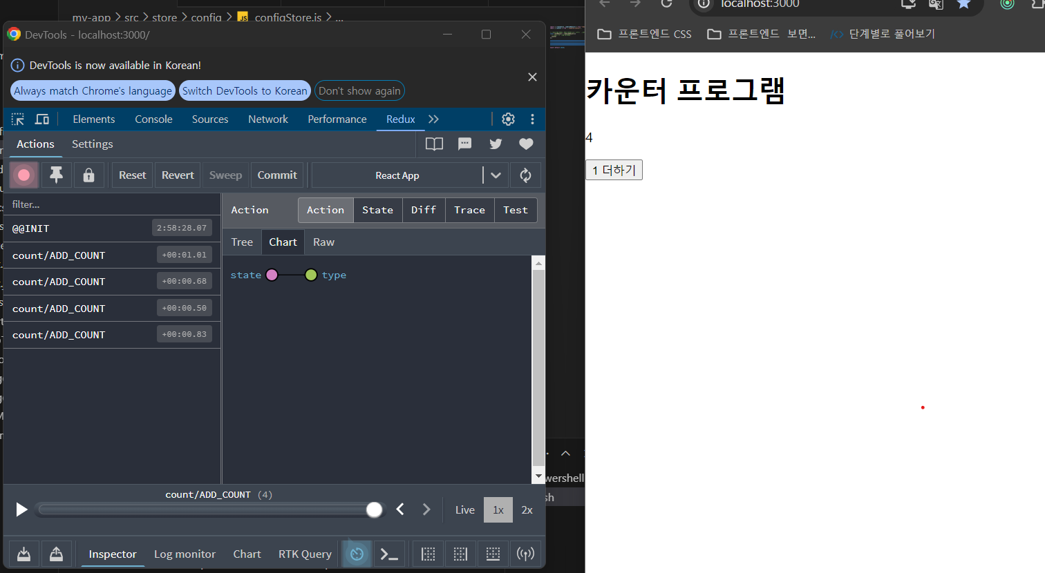 [ 1 ] 크롬에서 리덕스 개발자 도구를 설치합니다. 리덕스 개발자 도구를 사용하여야 합니다. 그리고 다음 명령어도 설치해주어야 합니다.