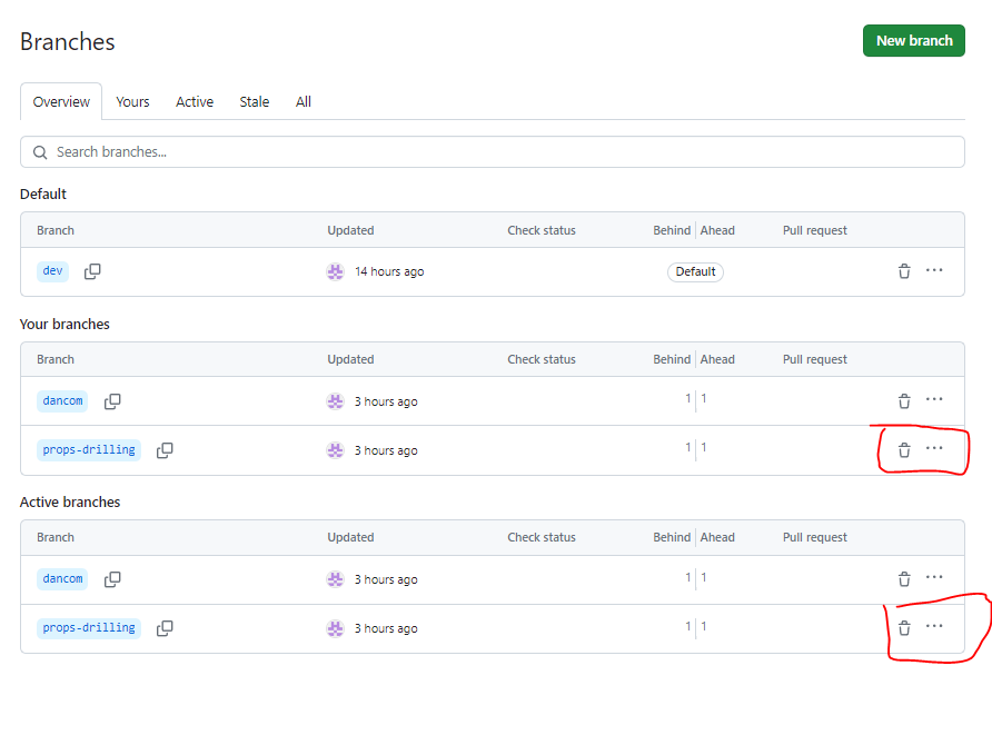 우리는 브랜치를 삭제하고 새로 추가할수 있는 페이지에 왔습니다. 여기서 우리는 제거해야 될 브랜치 props-drilling 을 제거 하겠습니다. 휴지통 모양 눌러주세요
