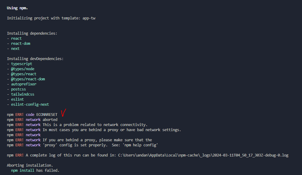 저는 npm install 이 실패로 들어갔군요..... 네트워크 관련 에러를 뺃는군요 ( 해결 )
