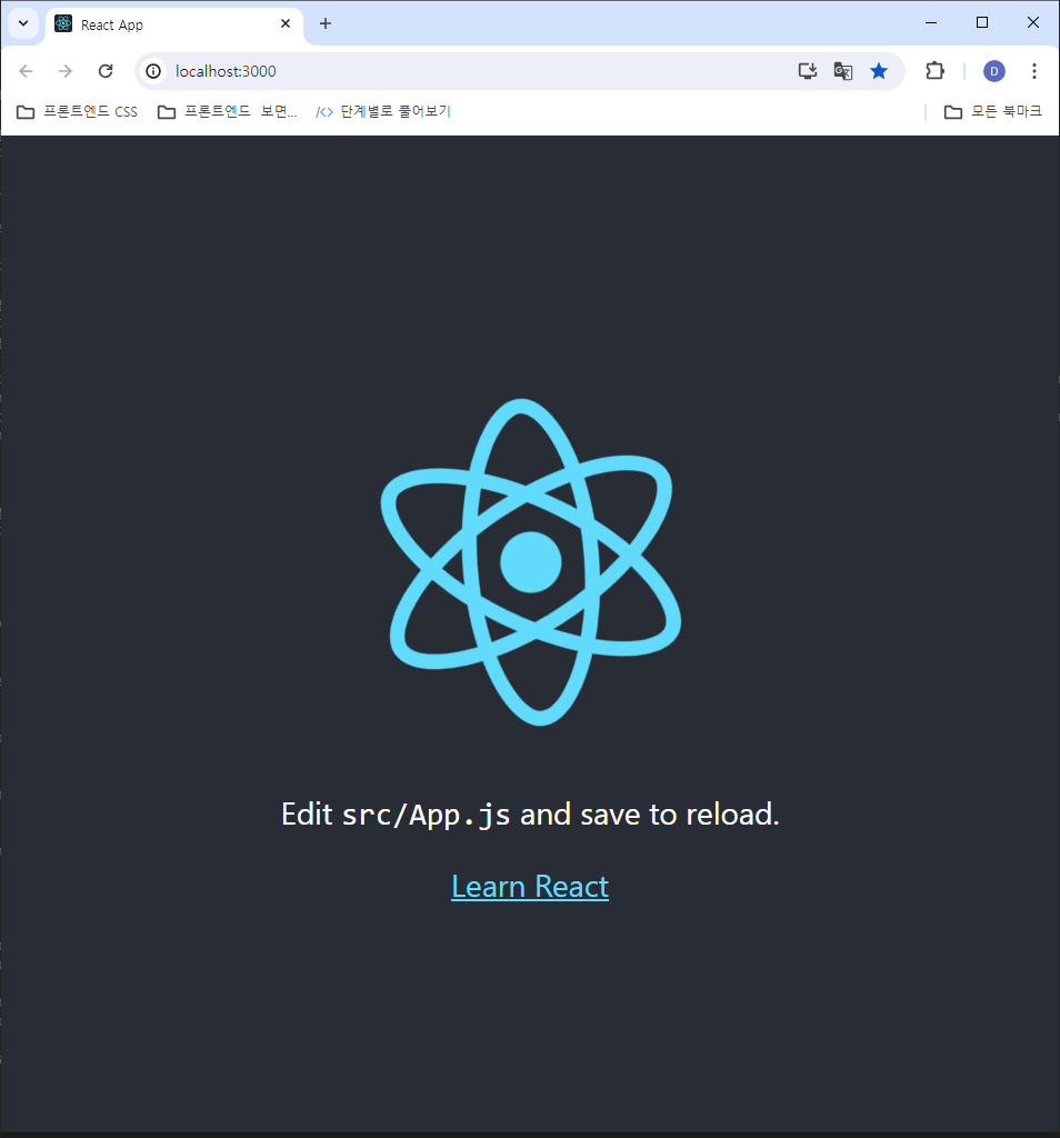 다음과 같이 npm start 했을 때 리액트 샘플 프로젝트가 나타난다면 성공입니다.!!!!!